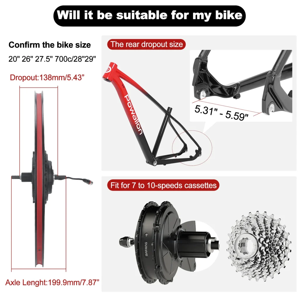 Universal Bike Motor Kit Compatibility: Fits 135-142mm (5.31″-5.59″) rear dropouts and 5-10 speed cassettes, designed for MTB, road, hybrid, and gravel bikes and other (26″-29″ wheels) .