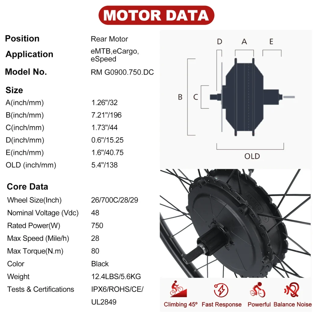 High-Power Ebike Conversion Kit: The BAFANG G0900 750W Rear Hub Motor delivers 1300W peak power (UL/CE certified), achieving speeds up to 28MPH+ with 80N·m torque, featuring IPX6 waterproof connectors for reliable performance in rain or steep 15° hill climbs.